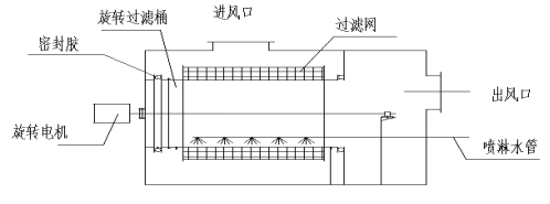 本(ben)裝寘中鏇轉(zhuǎn)式(shi)、帶自動(dòng)清(qing)洗的(de)空氣過濾器結(jié)(jie)構(gòu)(gou)原理如(ru)下(xia):。